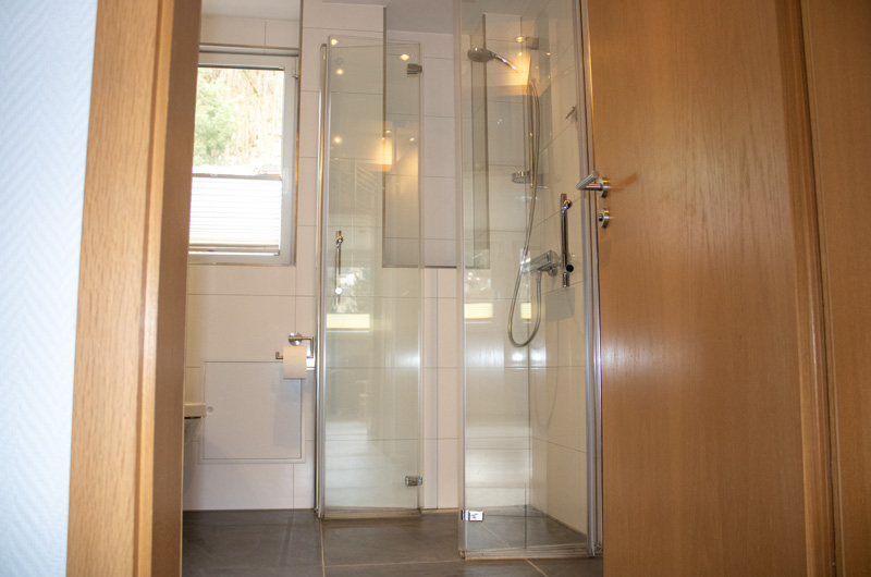 - Badezimmer mit einer begehbaren Dusche