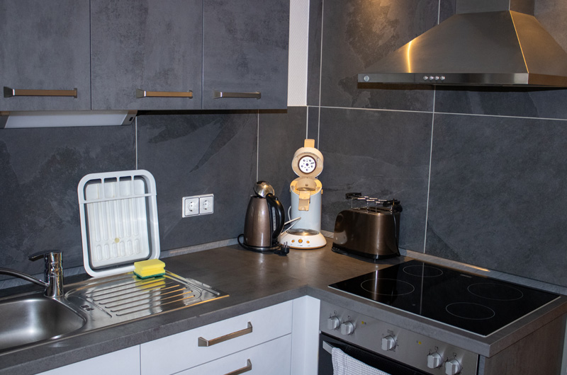 - voll ausgestattete Küche mit Kühlschrank, Herd, Kaffeemaschine, Wasserkocher, Toaster, Geschirr u.a. Küchenutensilien